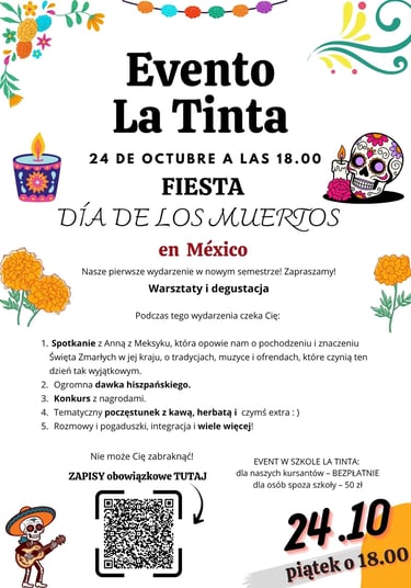 W La Tinta nie tylko uczysz się hiszpańskiego, także go doświadczasz! Każdego semestru organizujemy wyjątkowe wydarzenia kulturalne, które pozwalają Ci zanurzyć się w świecie hiszpańskojęzycznym w sposób autentyczny, zabawny i... pyszny.