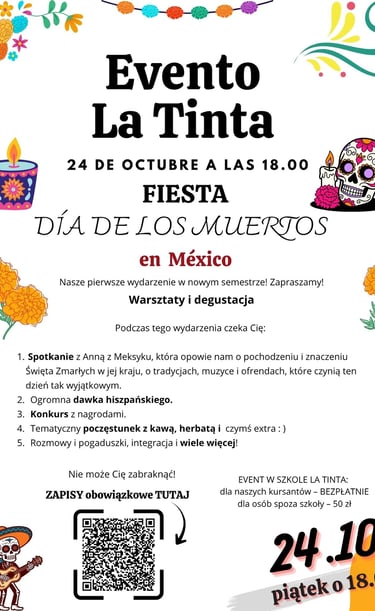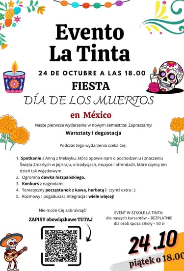 To święto pełne kolorów, muzyki i życia, w którym wspomina się bliskich z uśmiechem. Nasza lektorka z Meksyku opowie o jego znaczeniu i pokaże, jak wygląda prawdziwa meksykańska tradycja. Będzie piękna dekoracja, coś pysznego do spróbowania, dużo hiszpańskiego i konkurs z nagrodą. Przyjdź, odkryj magię Meksyku i przekonaj się, że Día de los Muertos to coś więcej niż Halloween!